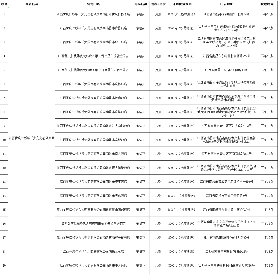 21日,南昌市市場(chǎng)監(jiān)督管理局公布退熱藥品投放名單(第二批),本批次名單共公布7家藥品零售企業(yè)共56家藥店的退熱藥品投放信息,分別是:江西黃慶仁棧華氏大藥房有限公司、江西大參林連鎖藥店有限公司、江西南華大藥房有限公司、江西匯仁堂藥品連鎖股份有限公司、江西昌盛大藥房有限公司、江西益豐大藥房連鎖有限公司、江西康每樂大藥房連鎖有限公司。