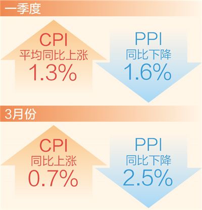 本報(bào)北京4月11日電 (記者劉志強(qiáng))國家統(tǒng)計(jì)局11日發(fā)布數(shù)據(jù)顯示:3月份,CPI(居民消費(fèi)價(jià)格指數(shù))同比上漲0.7%,漲幅比上月回落0.3個(gè)百分點(diǎn);PPI(工業(yè)生產(chǎn)者出廠價(jià)格指數(shù))同比下降2.5%,降幅比上月擴(kuò)大1.1個(gè)百分點(diǎn)。從一季度看,CPI平均同比上漲1.3%,PPI同比下降1.6%。一季度CPI持續(xù)運(yùn)行在合理區(qū)間,物價(jià)保持平穩(wěn)運(yùn)行,為全年物價(jià)穩(wěn)定奠定了堅(jiān)實(shí)基礎(chǔ)。