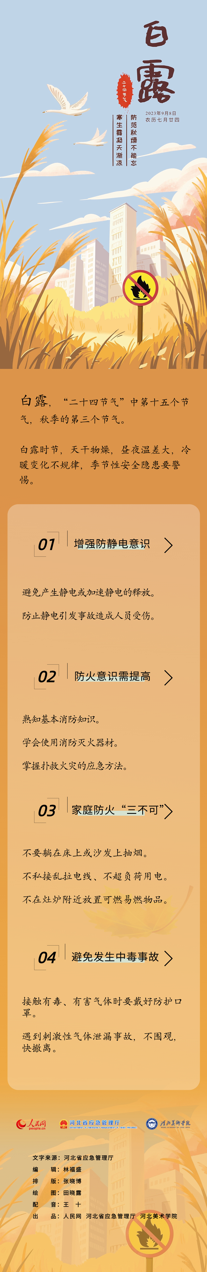 白露,“二十四節(jié)氣”中第十五個節(jié)氣,也是秋季的第三個節(jié)氣。白露時節(jié),天干物燥,晝夜溫差大,冷暖變化不規(guī)律,季節(jié)性安全隱患要警惕。近期,人民網(wǎng)與河北省應急管理廳共同推出二十四節(jié)氣安全海報。今天,和小編一起來了解白露時節(jié),有哪些安全避險小知識吧。