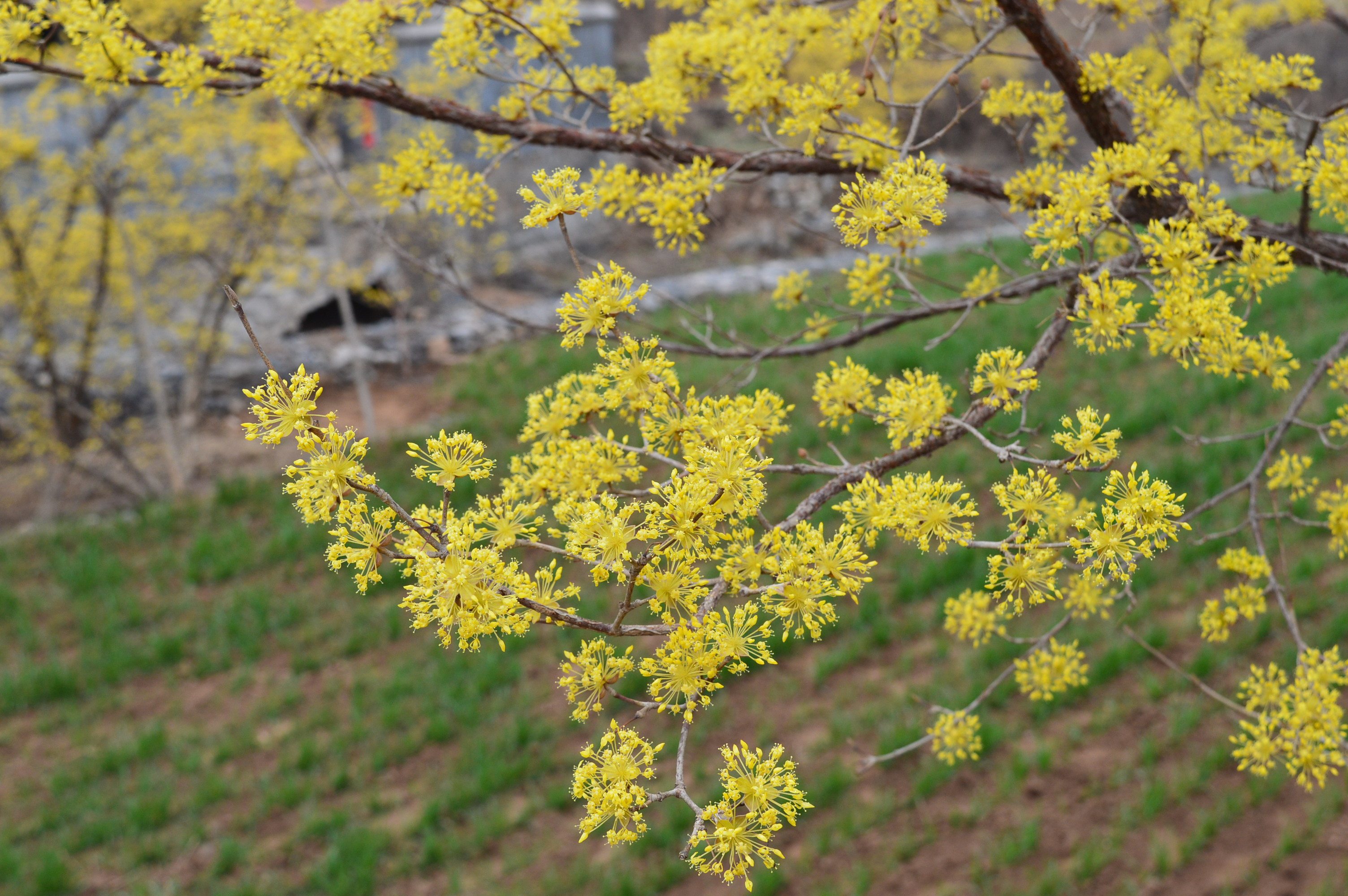 春天時(shí)綻放的山茱萸花。