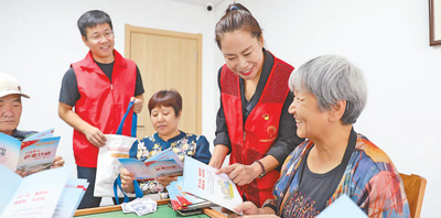 濱城區(qū)彭李街道學(xué)府社區(qū)志愿者在向居民講解防范養(yǎng)老詐騙知識(shí)。李 默 任增亮攝影報(bào)道