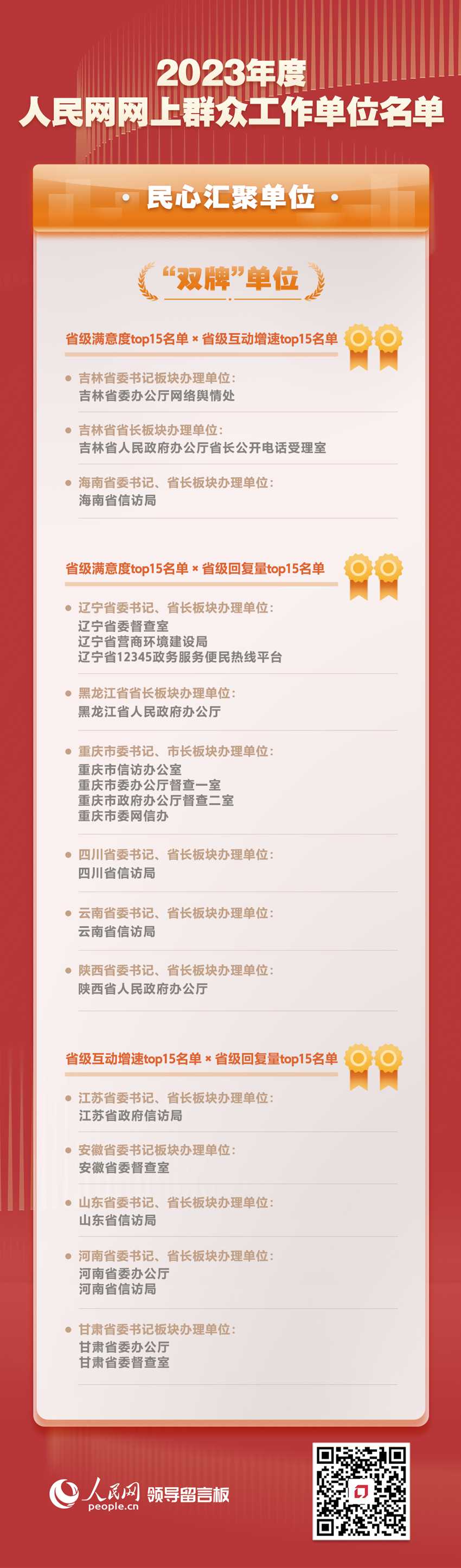 此次公布的名單綜合全國(guó)各地區(qū)各部門各單位近一年來(lái)的滿意度、互動(dòng)增速、回復(fù)量等指數(shù),著重突出各地區(qū)各部門各單位依托人民網(wǎng)“領(lǐng)導(dǎo)留言板”開展網(wǎng)上群眾工作情況,選出2023年度人民網(wǎng)網(wǎng)上群眾工作“民心匯聚單位”“實(shí)干擔(dān)當(dāng)單位”“匯智為民單位”和“活力奮進(jìn)單位”。
