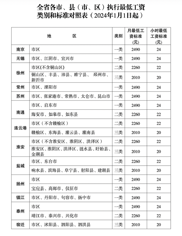 通知顯示,根據(jù)《最低工資規(guī)定》(原勞動保障部令第21號)和《江蘇省工資支付條例》規(guī)定,經(jīng)省人民政府同意,從2024年1月1日起調(diào)整全省最低工資標準。調(diào)整后,全省月最低工資標準為:南京、蘇州、無錫、常州、鎮(zhèn)江五市及南通市區(qū)、揚州市區(qū)、泰州市區(qū)等一類地區(qū)2490元;徐州市區(qū)(不含銅山區(qū))、連云港市區(qū)(不含贛榆區(qū))等二類地區(qū)2260元;宿遷全市等三類地區(qū)2010元。非全日制用工小時最低工資標準:一類地區(qū)24元,二類地區(qū)22元,三類地區(qū)20元。