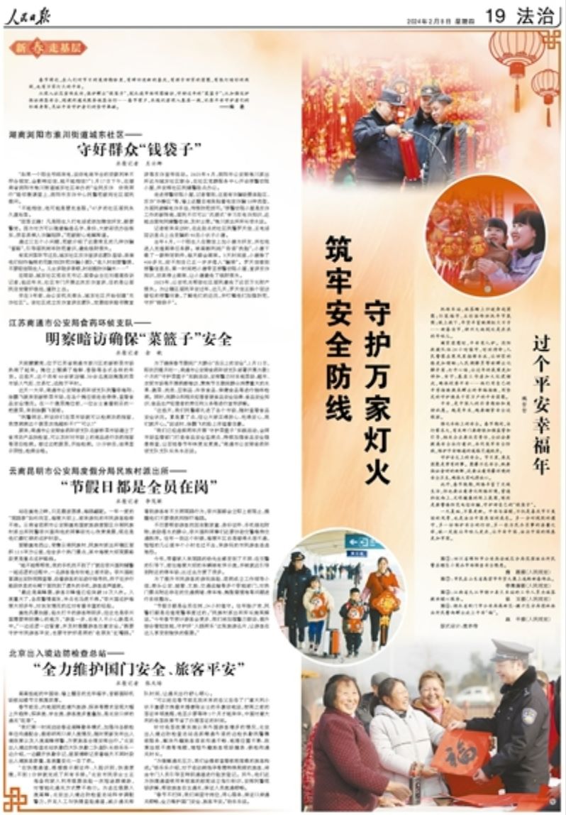 從深入社區(qū)宣傳反詐,保護(hù)群眾“錢袋子”,到扎進(jìn)市場(chǎng)明察暗訪,守好過(guò)年的“菜籃子”;從加強(qiáng)巡護(hù)保證游客安全,到便利通關(guān)服務(wù)旅客出行……春節(jié)前夕,本報(bào)記者深入基層一線,記錄平安守護(hù)者們的忙碌身影,見證平安守護(hù)者們的堅(jiān)守奉獻(xiàn)。