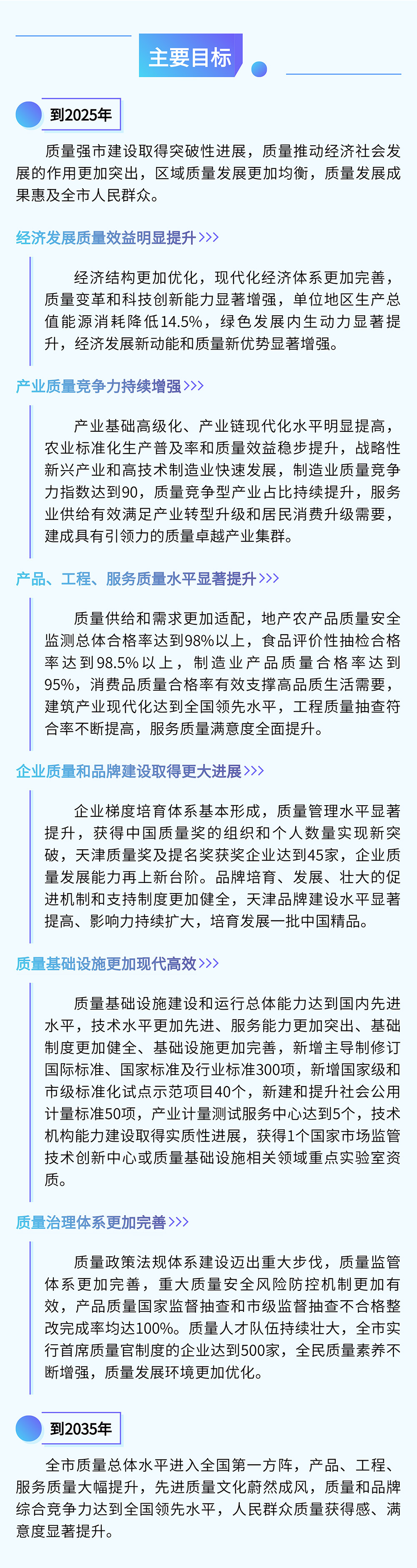 市市場(chǎng)監(jiān)管委相關(guān)負(fù)責(zé)人表示,《綱要》錨定“強(qiáng)市”定位,積極對(duì)標(biāo)先進(jìn)。綜合考量現(xiàn)實(shí)需求和發(fā)展趨勢(shì),立足“對(duì)標(biāo)先進(jìn)、領(lǐng)跑東部”,提出到2025年質(zhì)量強(qiáng)市建設(shè)取得突破性進(jìn)展的發(fā)展目標(biāo),明確制造業(yè)質(zhì)量競(jìng)爭(zhēng)力指數(shù)達(dá)到90,持續(xù)追趕質(zhì)量先進(jìn)省市;制造業(yè)產(chǎn)品質(zhì)量合格率達(dá)到95%,穩(wěn)步保持在全國前列。到2035年,進(jìn)一步在全國質(zhì)量工作格局中爭(zhēng)先進(jìn)位,提出天津市質(zhì)量總體水平進(jìn)入全國第一方陣、質(zhì)量和品牌綜合競(jìng)爭(zhēng)力達(dá)到全國領(lǐng)先水平等目標(biāo)愿景,充分展現(xiàn)天津奮力開創(chuàng)全面建設(shè)社會(huì)主義現(xiàn)代化大都市新局面的決心和信心。