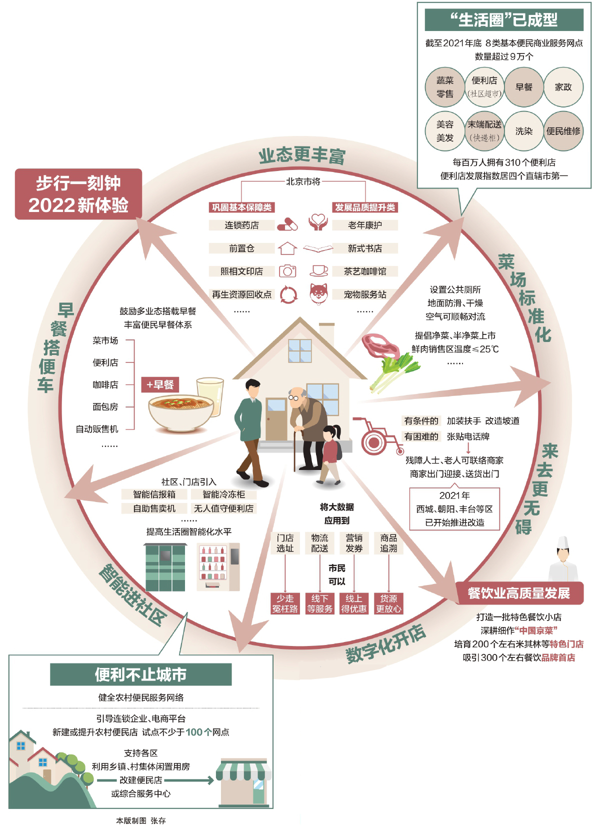 走出家門15分鐘內(nèi),有熱氣騰騰的早餐、新鮮上架的蔬果,修車、理發(fā)、取快遞一趟全部辦妥。截至2021年底,全市蔬菜零售、便利店(社區(qū)超市)、早餐、家政等8類基本便民商業(yè)網(wǎng)點超過9萬個,“一刻鐘便民生活圈”歷經(jīng)十余年建設(shè)輪廓已現(xiàn)。市商務(wù)局2022年將加快打造“一刻鐘便民生活圈”,優(yōu)化資金支持方向,優(yōu)先支持在便民設(shè)施不足區(qū)域新建亟須業(yè)態(tài)網(wǎng)點,從豐富業(yè)態(tài)、加快智能化數(shù)字化、餐飲業(yè)高質(zhì)量發(fā)展等方面入手提升“生活圈”體驗。 本報記者 馬婧 白歌