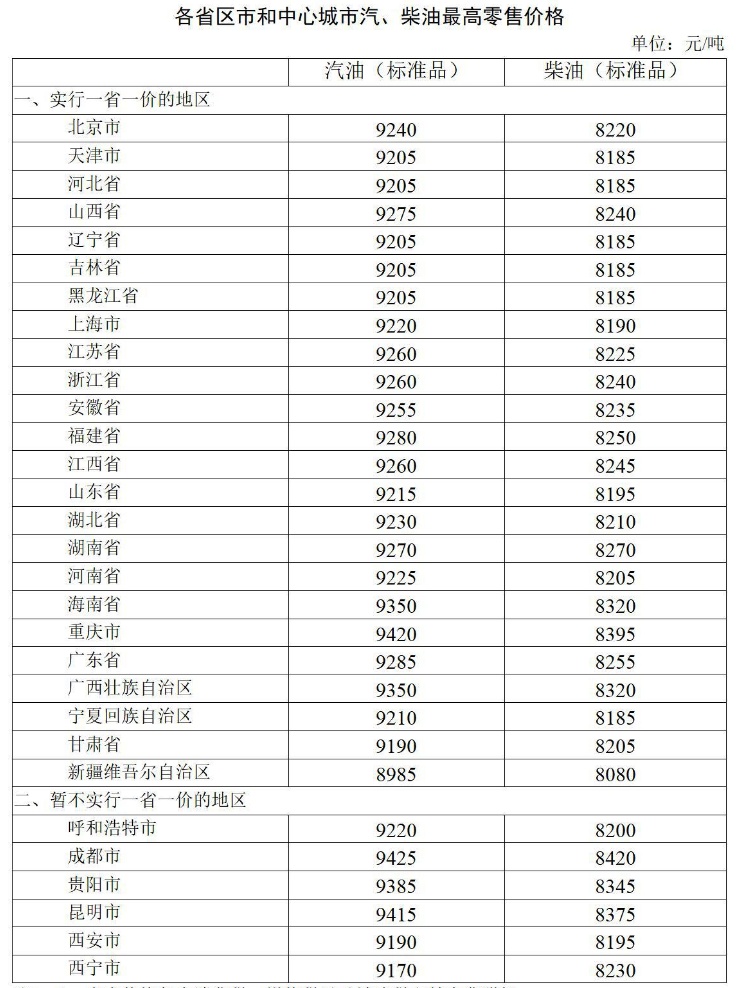 附:各省區(qū)市和中心城市汽、柴油最高零售價(jià)格