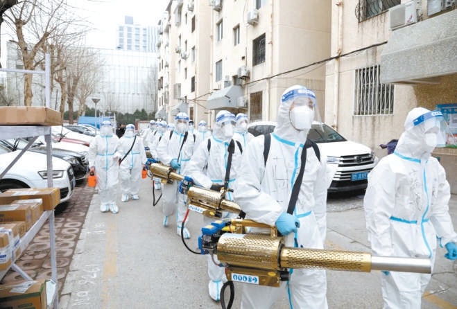 朝陽(yáng)藍(lán)天救援隊(duì)22名隊(duì)員近日換上防護(hù)服,走進(jìn)六里屯甜水西園等3個(gè)社區(qū),為社區(qū)做防疫消殺,以減輕社區(qū)和物業(yè)工作人員的壓力。隊(duì)員們穿著防護(hù)服、佩戴口罩、安全帽、橡膠手套,手持70多斤重的彌霧機(jī)和藥箱,采用地毯式噴灑消毒的方式,對(duì)社區(qū)封(管)控區(qū)的道路、綠化帶等區(qū)域進(jìn)行細(xì)致消殺,確保小區(qū)內(nèi)無(wú)死角、無(wú)盲區(qū)。