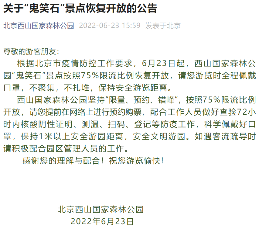 央廣網北京6月23日消息 據(jù)北京西山國家森林公園微信公眾號消息,根據(jù)北京市疫情防控工作要求,自6月23日起,西山國家森林公園“鬼笑石”景點按照75%限流比例恢復開放。