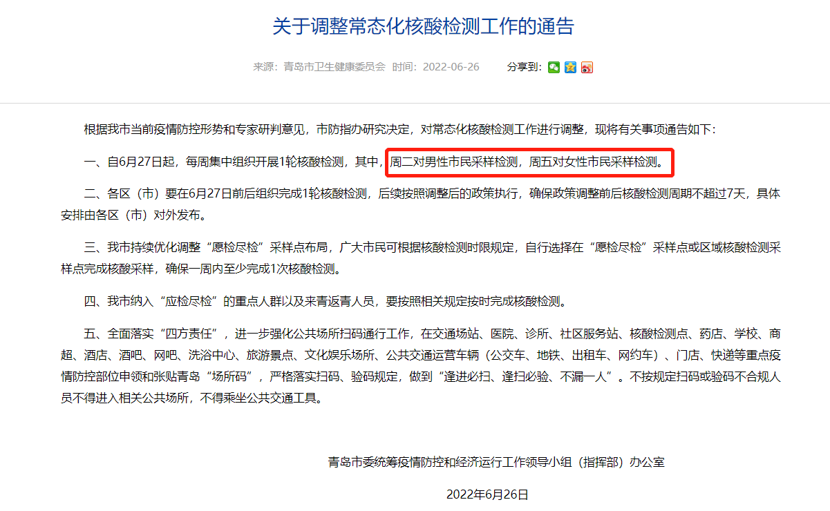 同時,青島市衛(wèi)健委強調(diào),“男女分開檢測”是基本原則,不是截然分開。若有特殊情況,各采樣點同樣會提供服務(wù)。另“男女分開檢測”主要用于社區(qū)集中組織,其他時間和需求,市民可以通過常態(tài)化開放的“愿檢盡檢”采樣點完成采樣,因此新政策不會給市民帶來不便。無論您在哪里采樣,一定要記得一周至少檢測一次。
