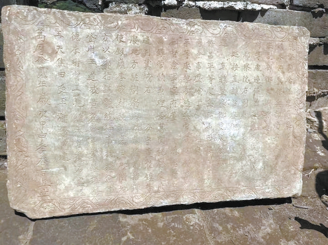 “發(fā)現(xiàn)一塊石碑,出土?xí)r碑文一面向下,推測這塊石碑原來鑲嵌在北側(cè)垛口墻內(nèi)側(cè),墻體傾斜倒塌后,石碑脫落。”項(xiàng)目考古負(fù)責(zé)人、北京考古研究院副研究員尚珩介紹。石碑為青石材質(zhì),保存完整,邊框刻著纏枝卷草紋。因?yàn)槊撀鋾r碑文面朝下,因此碑文保存完好,字體為繁體字,字跡娟秀,清晰可辨。