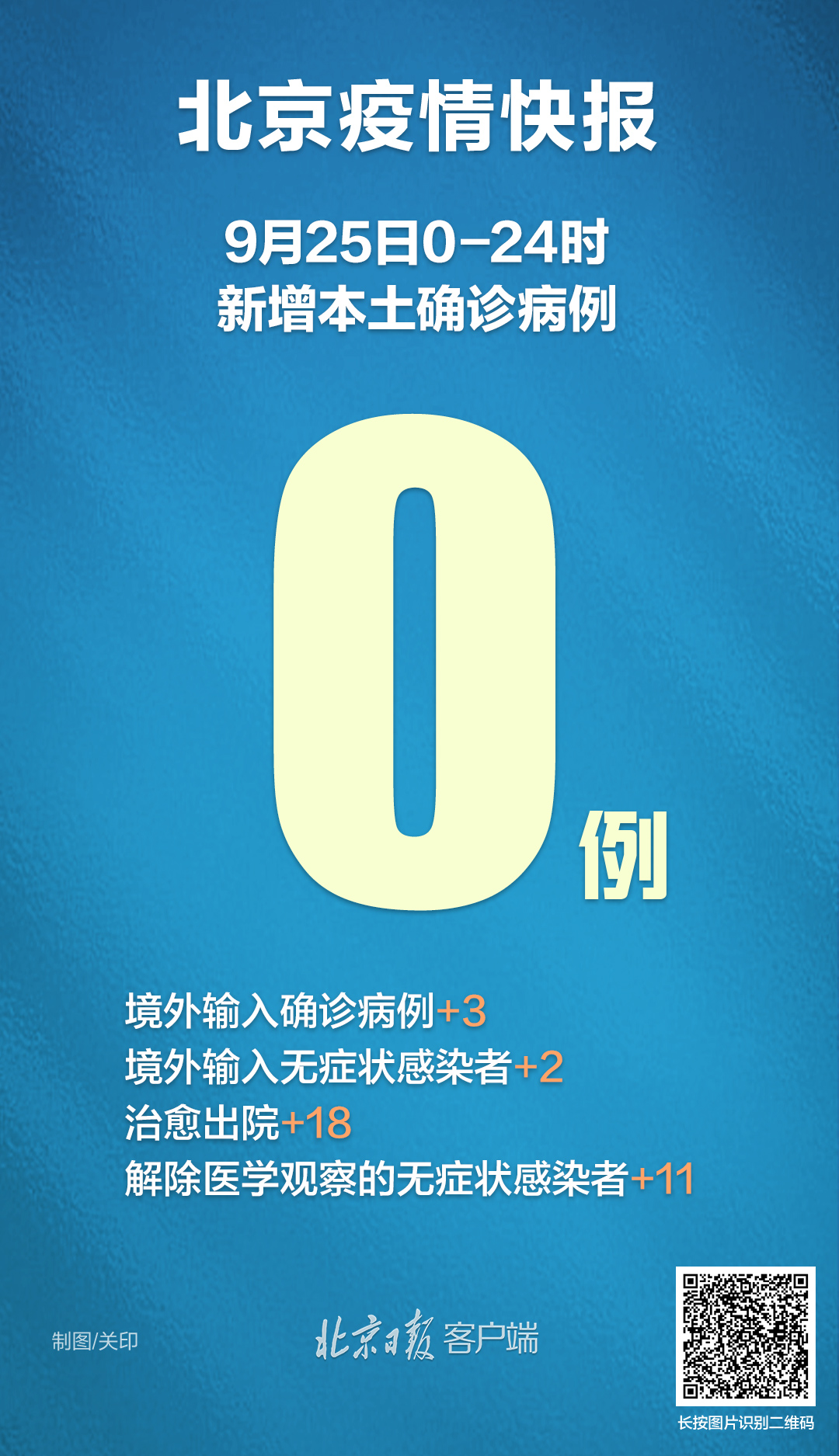 9月25日0時(shí)至24時(shí),北京無(wú)新增本土確診病例、疑似病例和無(wú)癥狀感染者;新增3例境外輸入確診病例和2例無(wú)癥狀感染者,無(wú)新增疑似病例。治愈出院18例,解除醫(yī)學(xué)觀察的無(wú)癥狀感染者11例。