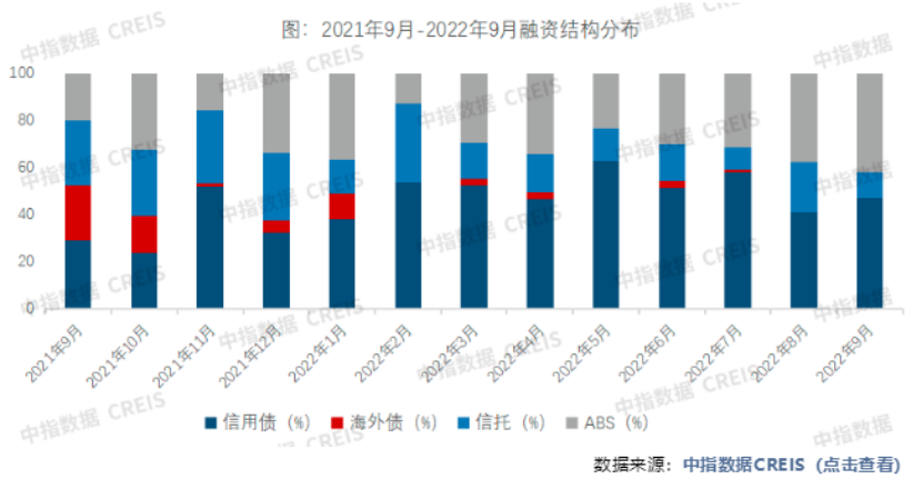 2022年1-9月,房地產(chǎn)企業(yè)非銀融資總額7331.5億元,同比下降52.6%。從融資結(jié)構(gòu)來(lái)看,信用債占比50.2%,同比提升19.9個(gè)百分點(diǎn);海外債占比僅為2.4%,同比下降14.0個(gè)百分點(diǎn);信托占比16.0%,同比下降15.1個(gè)百分點(diǎn);ABS占比31.4%,同比提升9.3個(gè)百分點(diǎn)。前三季度非銀融資總額分別占比33.1%、35.1%、32.1%,各季度融資比例差異不大,并未出現(xiàn)明顯的融資高峰期。
