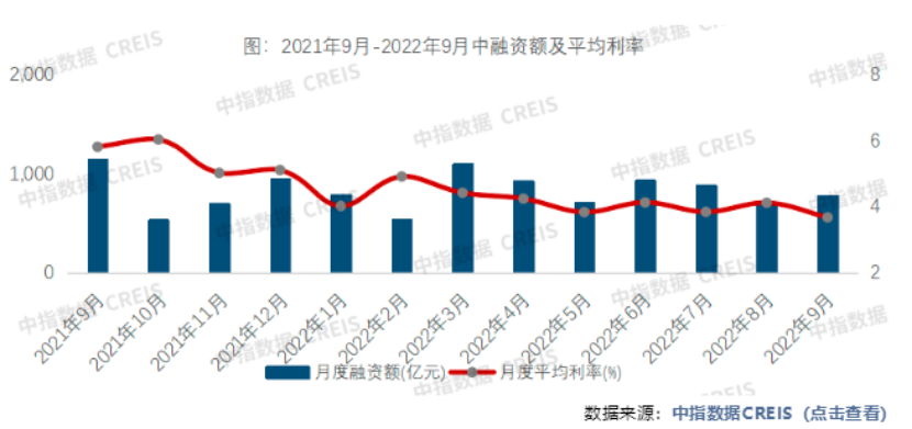 銷售業(yè)績(jī)有所回暖的同時(shí),房企面臨的資金壓力也在有所緩解。數(shù)據(jù)顯示,9月房企融資平均利率同比出現(xiàn)下降,信用債發(fā)行出現(xiàn)回暖跡象。據(jù)中指研究院監(jiān)測(cè),2022年9月房地產(chǎn)企業(yè)非銀融資總額為777.9億元,同比下降32.2%,環(huán)比上升13.3%,融資形勢(shì)稍有好轉(zhuǎn)。行業(yè)平均利率為3.67%,同比下降2.14個(gè)百分點(diǎn),環(huán)比下降0.44個(gè)百分點(diǎn)。