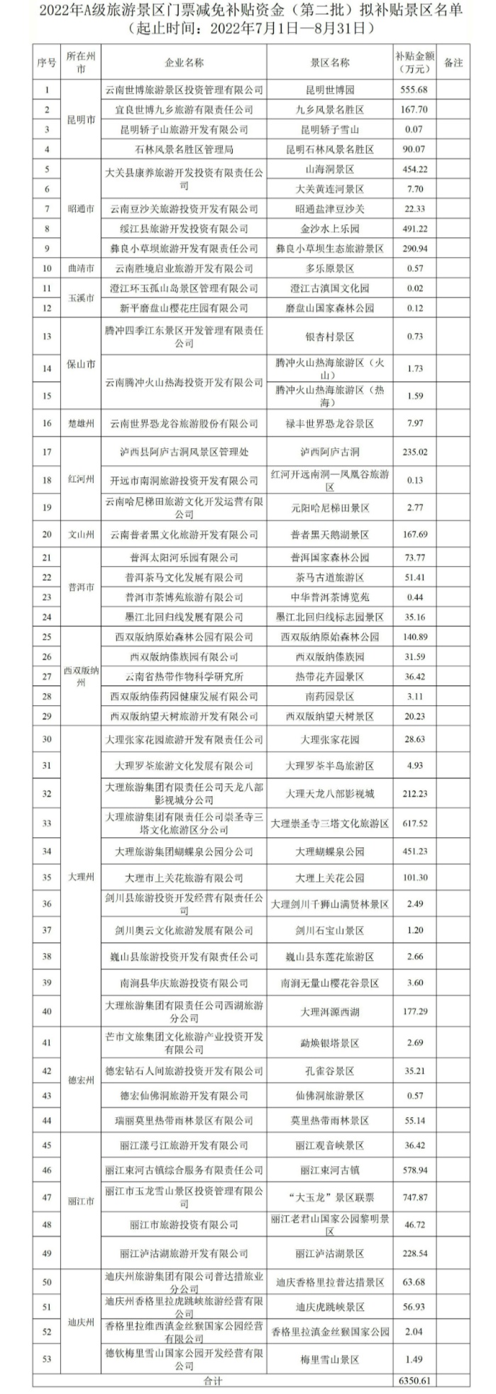 央廣網(wǎng)北京10月20日消息 據(jù)云南省文化和旅游廳消息,云南省文化和旅游廳已組織完成2022年A級旅游景區(qū)門票第二批(起止時間:2022年7月1日—8月31日)補貼資金審核工作,現(xiàn)對符合補貼資金撥付的A級旅游景區(qū)名單進行公示。