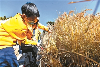 昨天上午,北京青年報(bào)記者來(lái)到先農(nóng)壇,觀耕臺(tái)前的一畝三分地上,水稻已經(jīng)成熟,稻穗在陽(yáng)光下隨風(fēng)搖曳,煥發(fā)出金燦燦的光澤,構(gòu)成獨(dú)特的古都秋景。隨著主持人開鑼、小朋友們齊喊“豐收嘍”,收割儀式正式開始。在場(chǎng)嘉賓和10名小朋友一起收割第一鐮新稻子,寓意豐收碩果新開始。