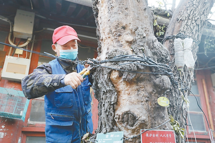 日前,在園林綠化部門、社區(qū)居委會工作人員的陪同下,東四街道綜合行政執(zhí)法隊來到東四六條某平房院。在院落南側(cè)房屋過道處,一棵樹齡約110年、掛著二級保護(hù)標(biāo)牌的棗樹特別扎眼。古樹虬曲蒼勁,樹皮斑駁,在樹杈處,數(shù)根電線、鐵絲緊緊纏繞著樹干,由于年代久遠(yuǎn),部分鐵絲已深深嵌進(jìn)了樹皮。居民利用古樹掛衣服、掛盆栽,還在樹身上釘了釘子。古樹根部周圍地面覆蓋了一層厚厚的水泥和瀝青,堆放著廢舊紙箱和花盆等雜物。工作人員立即找來工具,將樹身上的電線、鐵絲、釘子一一清除,清理了堆放在樹根處的雜物,并對樹根部的土壤進(jìn)行疏松,使古樹得以“脫困”。