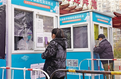 11月23日,朝陽(yáng)區(qū)鴻博家園第四社區(qū),居民掃碼登記進(jìn)行核酸檢測(cè)。 新京報(bào)記者 王飛 攝