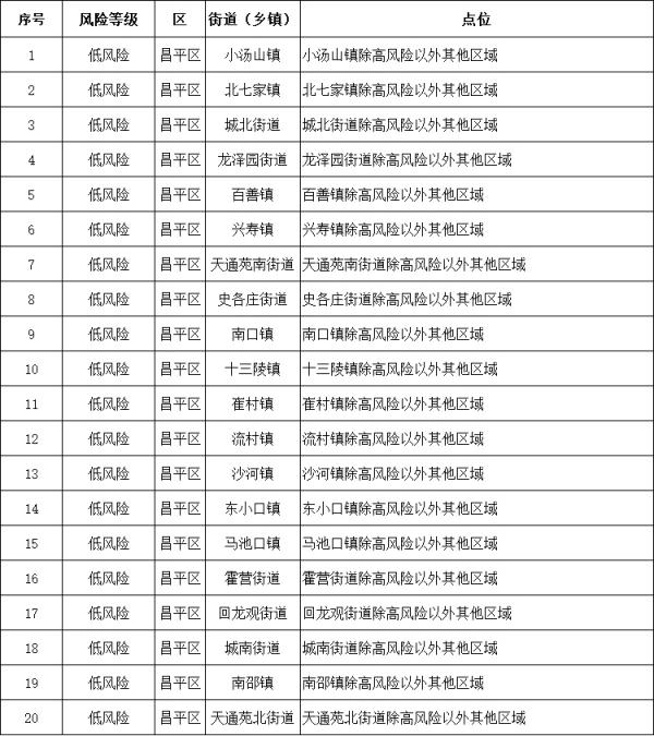 據(jù)北京市昌平區(qū)疾病預(yù)防控制中心通報,截至12月4日24 時,昌平區(qū)共有高風(fēng)險區(qū)222個,低風(fēng)險區(qū)20個,詳情如下:
