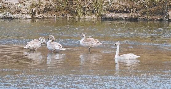 四只疣鼻天鵝幼鳥活動(dòng)在河畔淺灘。 吳嵐攝
