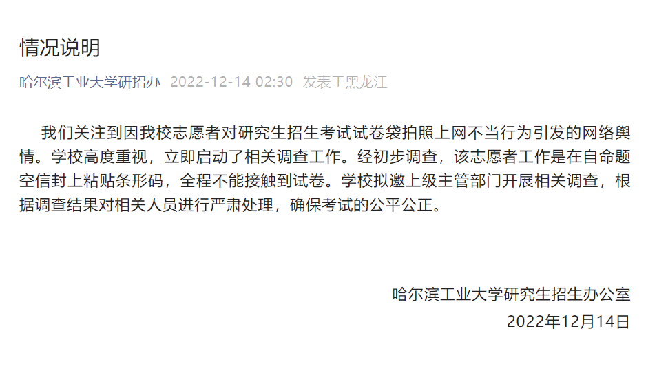 央廣網(wǎng)哈爾濱12月14日消息(記者馬俊瑋)12月14日,哈爾濱工業(yè)大學(xué)研究生招生辦公室通報:我們關(guān)注到因我校志愿者對研究生招生考試試卷袋拍照上網(wǎng)不當行為引發(fā)的網(wǎng)絡(luò)輿情。學(xué)校高度重視,立即啟動了相關(guān)調(diào)查工作。經(jīng)初步調(diào)查,該志愿者工作是在自命題空信封上粘貼條形碼,全程不能接觸到試卷。學(xué)校擬邀上級主管部門開展相關(guān)調(diào)查,根據(jù)調(diào)查結(jié)果對相關(guān)人員進行嚴肅處理,確保考試的公平公正。