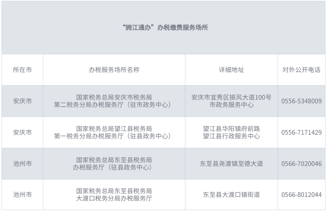 2.通辦場所。1.國家稅務(wù)總局安慶市稅務(wù)局第二稅務(wù)分局辦稅服務(wù)廳(駐市政務(wù)中心);2.國家稅務(wù)總局望江縣稅務(wù)局第一稅務(wù)分局辦稅服務(wù)廳(駐縣政務(wù)中心);3.國家稅務(wù)總局東至縣稅務(wù)局辦稅服務(wù)廳(駐縣政務(wù)中心);4.國家稅務(wù)總局東至縣稅務(wù)局大渡口稅務(wù)分局辦稅服務(wù)廳,以上4個辦稅繳費(fèi)場所均可辦理“擁江通辦”事項,辦稅繳費(fèi)場所詳見附件1。