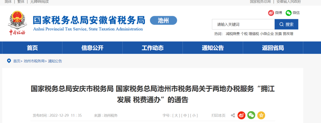 近日,為方便安徽安慶池州兩地納稅人繳費(fèi)人辦理跨區(qū)域涉稅事項,落實安慶池州“一江兩岸擁江發(fā)展”規(guī)劃,進(jìn)一步優(yōu)化稅收營商環(huán)境。國家稅務(wù)總局安慶市稅務(wù)局、國家稅務(wù)總局池州市稅務(wù)局發(fā)布《關(guān)于兩地辦稅服務(wù)“擁江發(fā)展稅費(fèi)通辦”的通告》。
