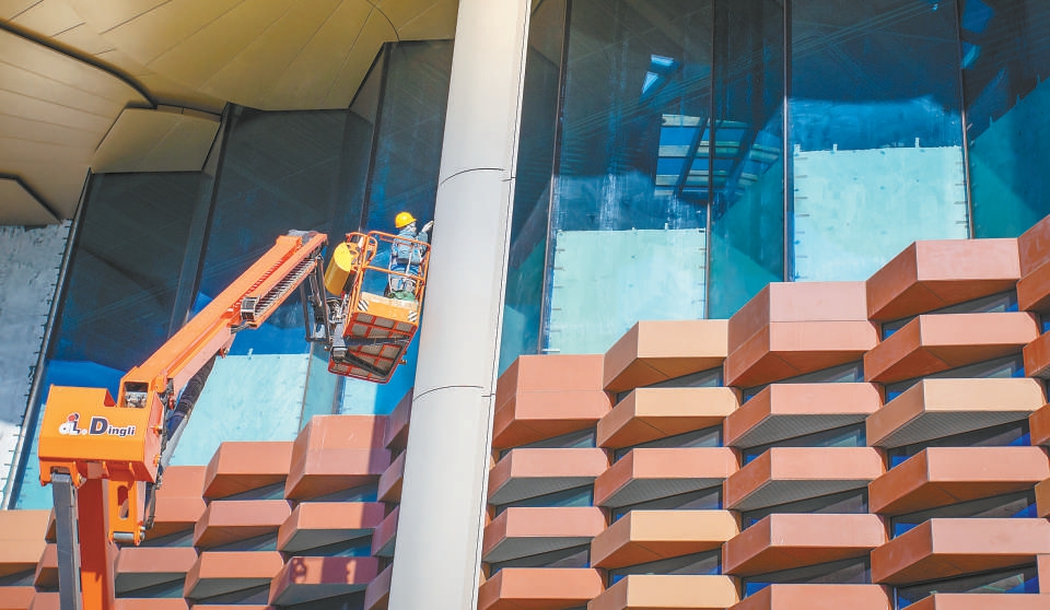 城市副中心圖書館項(xiàng)目周邊,首都博物館東館、大劇院項(xiàng)目同樣按下了建設(shè)“加速鍵”。僅首都博物館東館項(xiàng)目,目前就有600余人堅(jiān)守崗位,在確保疫情防控安全的前提下盡最大努力確保工程進(jìn)度。目前,首都博物館東館屋面幕墻安裝基本完成,正在進(jìn)行室內(nèi)吊頂鋁拉網(wǎng)收尾,室內(nèi)普通裝修完成60%以上,精裝工程完成45%以上,機(jī)電安裝工程完成75%以上。