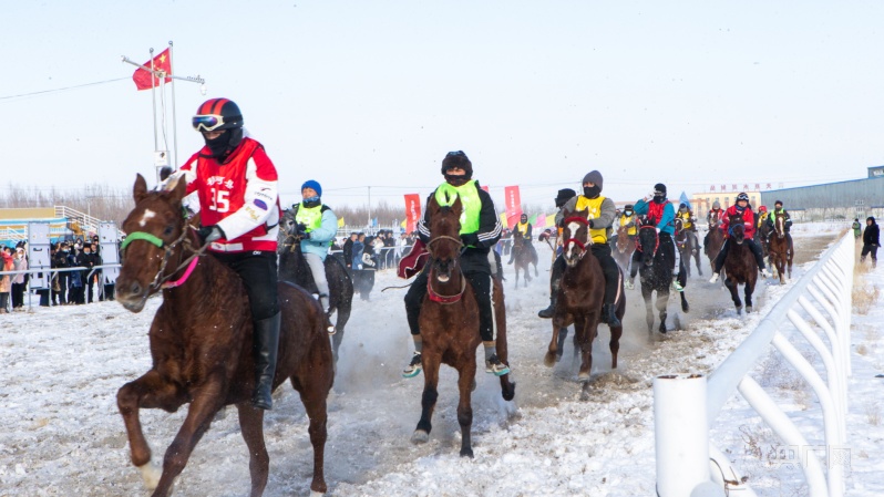 “馬匹就位,預(yù)備……”隨著裁判一聲令下,騎手們駕馭的賽馬如離弦之箭,爭先恐后奔騰而過,雪地上馬蹄聲聲、雪花飛揚(yáng)。參賽選手揮舞韁繩,策馬揚(yáng)鞭,像一陣疾風(fēng)掠過,盡情地在賽道上體驗(yàn)著激情與速度。緊張刺激的比賽贏得觀眾的一片歡呼,大家紛紛拿出手機(jī)拍照,用鏡頭記錄下精彩的瞬間,現(xiàn)場歡呼聲、助威聲不絕于耳,把比賽氣氛推向了高潮。