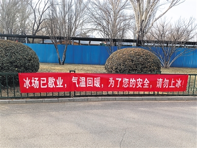 2月5日,玉淵潭公園南門貼著“請勿上冰”的橫幅。 新京報記者 彭鏡陶 攝