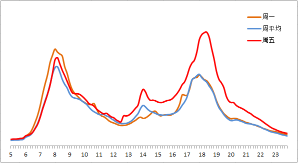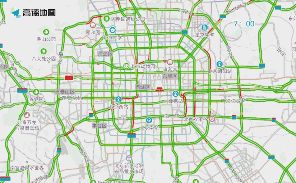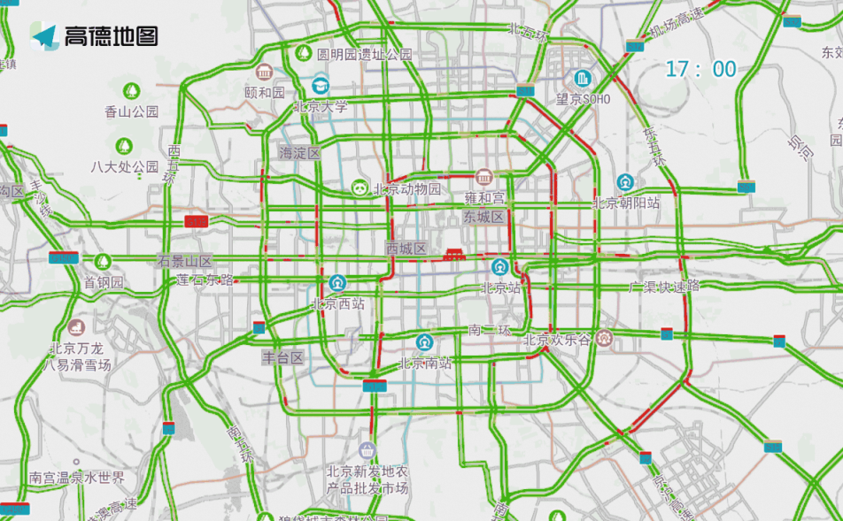 晚高峰期間,東、西、北二、三、四、五環(huán),東六環(huán)部分路段,以及萬泉河路至圓明園西路、通惠河北路、蓮石東路等城區(qū)道路出城方向車流集中,京藏高速、京承高速、京通快速、京港澳高速、機場高速等高速公路出京方向將出現(xiàn)高峰車流,高峰時段為17:00—19:00,周五晚高峰提前且持續(xù)時間較長。
