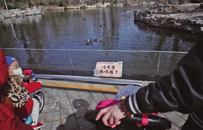 3月16日,北京動(dòng)物園,水禽湖邊多處設(shè)置了請(qǐng)勿投喂提示牌。