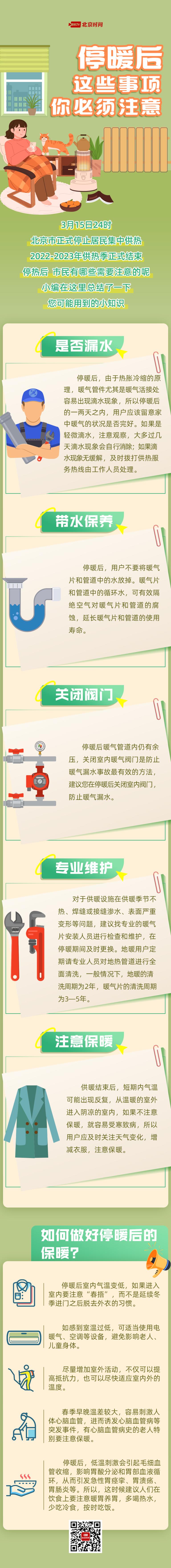 今日(16日)起,北京市正式停止居民集中供熱,都有哪些注意事項?首先要做好供熱設(shè)備的維護(hù),包括及時檢測暖氣管道是否漏水,不要放掉暖氣管道中的水,停暖后及時關(guān)閉室內(nèi)閥門并安排專業(yè)人員對供暖設(shè)施進(jìn)行維護(hù)和清洗。在停暖后還需注意保暖,如注意“春捂”,增加室外活動,注重心血管和腸胃的保暖,避免早晚溫差刺激。停暖知識帖來了,戳圖了解→