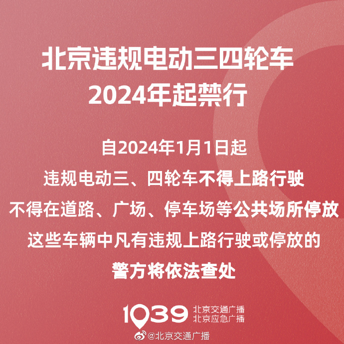 2022年,北京市共發(fā)生違規(guī)電動(dòng)三、四輪車(chē)交通事故131起,死亡138人。市交管局于4月12日再次強(qiáng)調(diào),自2024年1月1日起,違規(guī)電動(dòng)三、四輪車(chē)不得上路行駛,不得在道路、廣場(chǎng)、停車(chē)場(chǎng)等公共場(chǎng)所停放。這些車(chē)輛中凡有違規(guī)上路行駛或停放的,警方將依法查處。