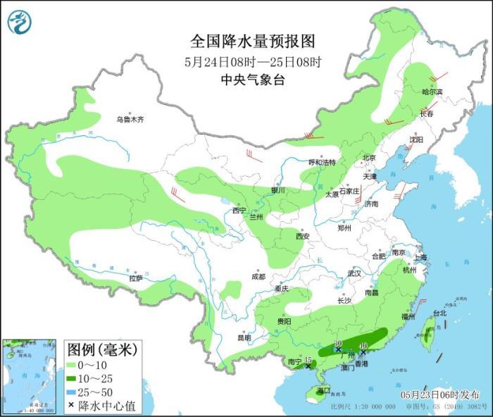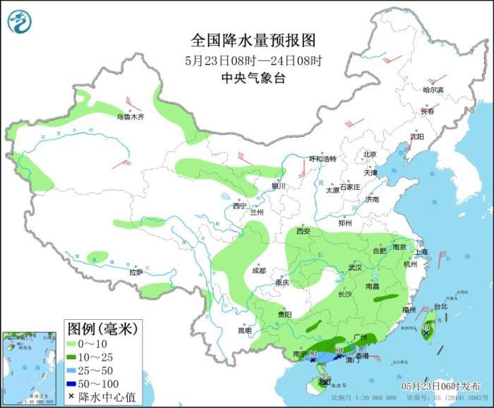 5月23日08時至24日08時,華南南部、臺灣島等地部分地區(qū)有中到大雨,其中,廣西東南部沿海、廣東西南部沿海等地局地有暴雨(50~90毫米)。新疆、內(nèi)蒙古中西部和東北部等地部分地區(qū)有4~6級風(fēng)。