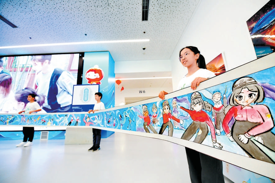 府學(xué)胡同小學(xué)的同學(xué)在“冰絲帶”展示了自己參與實踐課程后,運用所學(xué)知識繪制的長卷。本報記者 和冠欣攝