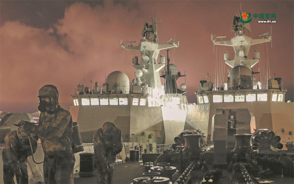 夜幕下,海軍某支隊(duì)官兵正在進(jìn)行洗消作業(yè)。王春光 攝