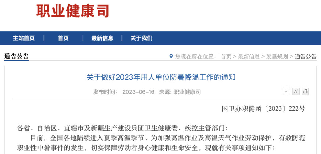 通知指出,目前,全國各地陸續(xù)進(jìn)入夏季高溫季節(jié)。近年來,夏季高溫作業(yè)及高溫天氣作業(yè)導(dǎo)致勞動(dòng)者中暑死亡的事件時(shí)有發(fā)生,對(duì)勞動(dòng)者身心健康和生命安全造成嚴(yán)重威脅。各級(jí)衛(wèi)生健康行政部門和疾控主管部門要進(jìn)一步明確工作責(zé)任,加強(qiáng)組織領(lǐng)導(dǎo),系統(tǒng)謀劃部署,協(xié)同推進(jìn)用人單位防暑降溫工作和各項(xiàng)職業(yè)病預(yù)防工作。