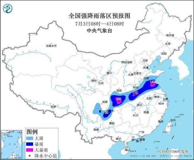 預(yù)計,7月3日08時至4日08時,山東中南部、江蘇北部、安徽北部、河南東部和南部、湖北北部和西部、陜西南部、重慶、四川東部、貴州西北部、云南東北部以及廣東西南部沿海等地部分地區(qū)有大到暴雨,其中,山東南部、江蘇北部、河南南部、重慶北部、四川東北部等地局地有大暴雨(100~160毫米)。上述部分地區(qū)伴有短時強(qiáng)降水(最大小時降雨量30~50毫米,局地可超過60毫米),局地有雷暴大風(fēng)等強(qiáng)對流天氣。