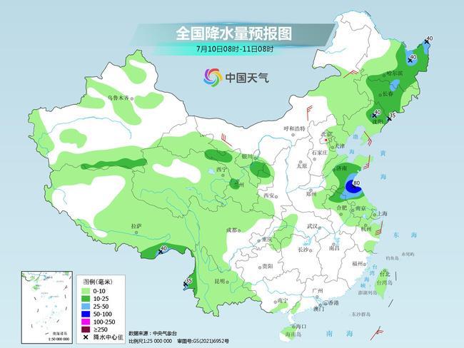 其中今天,黑龍江中東部、吉林、遼寧東北部、山東中南部、江蘇北部、安徽北部、云南西部、西藏東南部等地的部分地區(qū)有中到大雨,其中,山東東南部、江蘇北部等地局地有暴雨(50~80毫米)。
