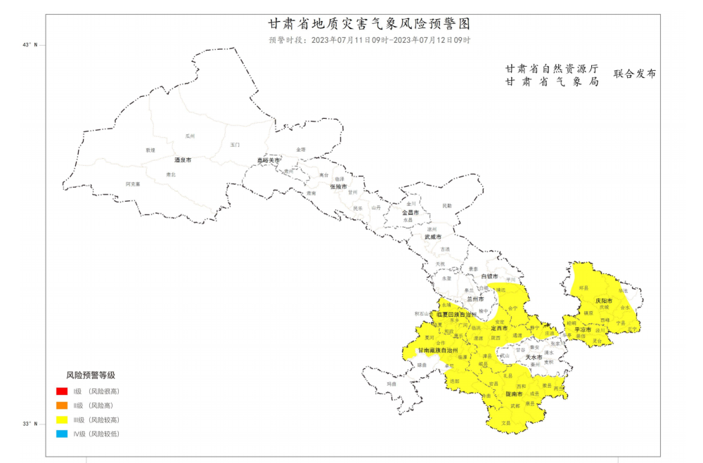 甘肅省自然資源廳、甘肅省氣象局于7月11日9時聯(lián)合發(fā)布地質(zhì)災(zāi)害氣象風(fēng)險預(yù)警:預(yù)計未來24小時內(nèi),白銀市靖遠縣、平川區(qū)、白銀區(qū)、會寧縣,定西市安定區(qū)、臨洮縣、通渭縣、渭源縣、隴西縣、漳縣、岷縣,甘南藏族自治州夏河縣、合作市、卓尼縣、臨潭縣、迭部縣、舟曲縣,臨夏回族自治州永靖縣、積石山保安族東鄉(xiāng)族撒拉族自治縣、東鄉(xiāng)族自治縣、臨夏縣、和政縣、廣河縣、康樂縣,隴南市禮縣、宕昌縣、兩當縣、西和縣、徽縣、成縣、武都區(qū)、康縣、文縣,平?jīng)鍪徐o寧縣、崆峒區(qū)、涇川縣、莊浪縣、華亭市、崇信縣、靈臺縣,慶陽市環(huán)縣、華池縣、合水縣、鎮(zhèn)原縣、慶城縣、寧縣、西峰區(qū)、正寧縣因氣象因素致地質(zhì)災(zāi)害發(fā)生的風(fēng)險較高(黃色預(yù)警),部分地區(qū)預(yù)計6小時內(nèi)降雨量將達50毫米以上,已達50毫米以上的地區(qū)降雨可能持續(xù)。其中甘南州夏河縣累積雨量可達50毫米以上,隴南市文縣最大小時雨強可達30毫米以上。