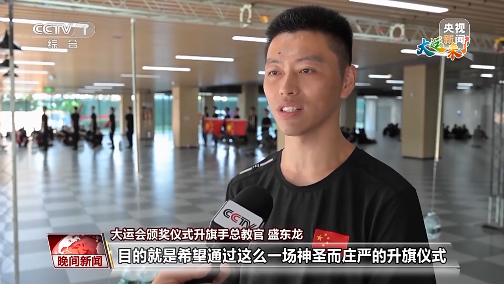 大運(yùn)會(huì)頒獎(jiǎng)儀式升旗手總教官 盛東龍:目的就是希望通過一場(chǎng)神圣而莊嚴(yán)的升旗儀式來感染他們,來激發(fā)和增強(qiáng)他們的愛國(guó)情懷和使命擔(dān)當(dāng)。