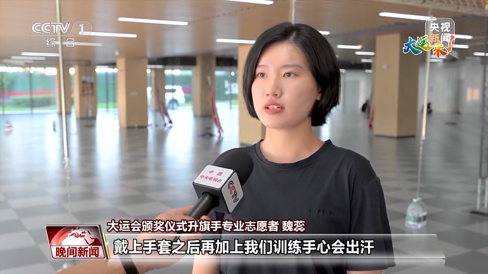 大運(yùn)會(huì)頒獎(jiǎng)儀式升旗手專業(yè)志愿者 魏蕊:我們面對(duì)的是國(guó)旗。當(dāng)運(yùn)動(dòng)員在運(yùn)動(dòng)場(chǎng)上贏得屬于自己國(guó)家榮譽(yù)的時(shí)候,我們的工作就是幫他們?cè)忈尯脤儆谒麄冏约旱囊环輼s譽(yù)。