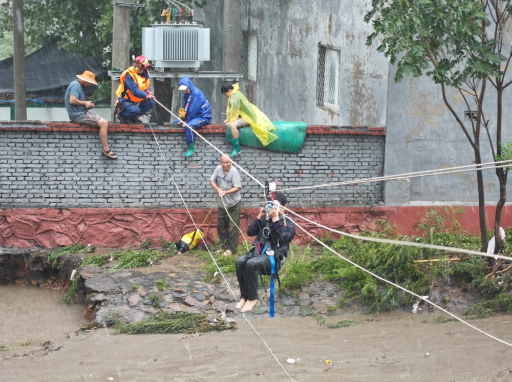 隨后,消防救援人員又來到距離此處約50米的第二處現(xiàn)場。在一個(gè)院子里,有16人被困,包括1名87歲老人和2名3歲兒童。消防救援人員搭設(shè)繩索通道,協(xié)助有行動能力的群眾在消防救援人員幫扶下蹚河轉(zhuǎn)移,同時(shí)對沒有行動能力的老人、兒童采取背負(fù)及橡皮艇救援的方式轉(zhuǎn)移。