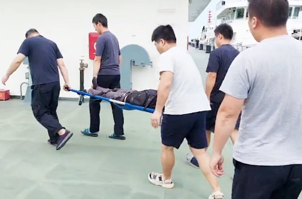 經(jīng)過(guò)綜合研判,船長(zhǎng)康宜群決定立即放下吃水淺且航速快的船上小艇,克服涌浪帶來(lái)的困難,快速駛向求救漁船。9海里的距離,小艇僅用20分鐘便順利接到傷員,并第一時(shí)間送至呂四港2+2碼頭。