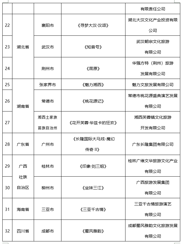 央廣網(wǎng)北京9月27日消息 據(jù)文化和旅游部網(wǎng)站消息,為堅持以文塑旅、以旅彰文,推進(jìn)文化產(chǎn)業(yè)和旅游產(chǎn)業(yè)深度融合發(fā)展,根據(jù)《文化和旅游部產(chǎn)業(yè)發(fā)展司關(guān)于開展全國旅游演藝精品名錄申報工作的通知》部署,在各省級文化和旅游行政部門推薦申報基礎(chǔ)上,經(jīng)專家評審和綜合研究,文化和旅游部產(chǎn)業(yè)發(fā)展司確定了全國旅游演藝精品名錄入選項目名單,現(xiàn)予以公布。
