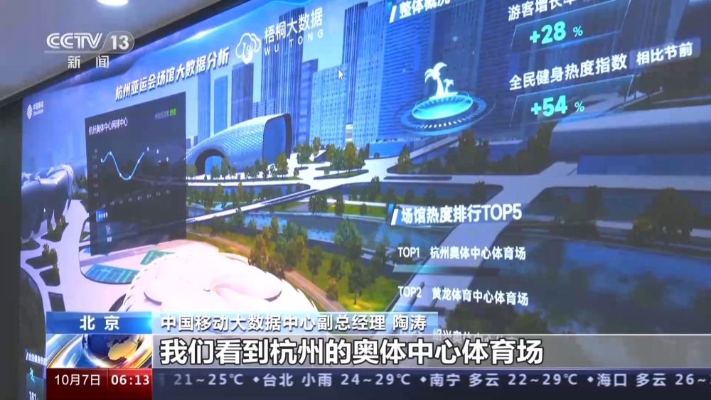中國移動大數(shù)據(jù)中心副總經(jīng)理 陶濤:前往亞運(yùn)會主要舉辦城市的游客的數(shù)量相比節(jié)前一周日均增幅超過28%,主要是來自長三角地區(qū)以及津京冀等地區(qū)。根據(jù)我們對于線上訂票以及搜索這些數(shù)據(jù)的分析,我們看到杭州的奧體中心體育場、黃龍體育中心體育場以及紹興奧體中心體育館這三個場館是最熱的體育場館。