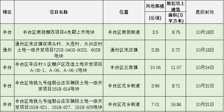 根據(jù)北京市規(guī)自委網站顯示,10月份北京還將有5宗宅地入市,其中豐臺4宗、通州1宗。