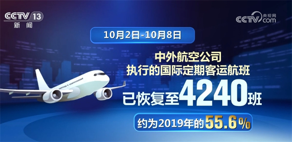 民航局最新數(shù)據(jù)顯示,上周(10月2日—10月8日),中外航空公司執(zhí)行的國(guó)際定期客運(yùn)航班已恢復(fù)至4240班,約為2019年的55.6%;其中中方公司執(zhí)行2729班,占比64.4%,恢復(fù)至2019年的約57.5%;外航執(zhí)行1511班,占比35.6%,恢復(fù)至2019年的約42.5%。