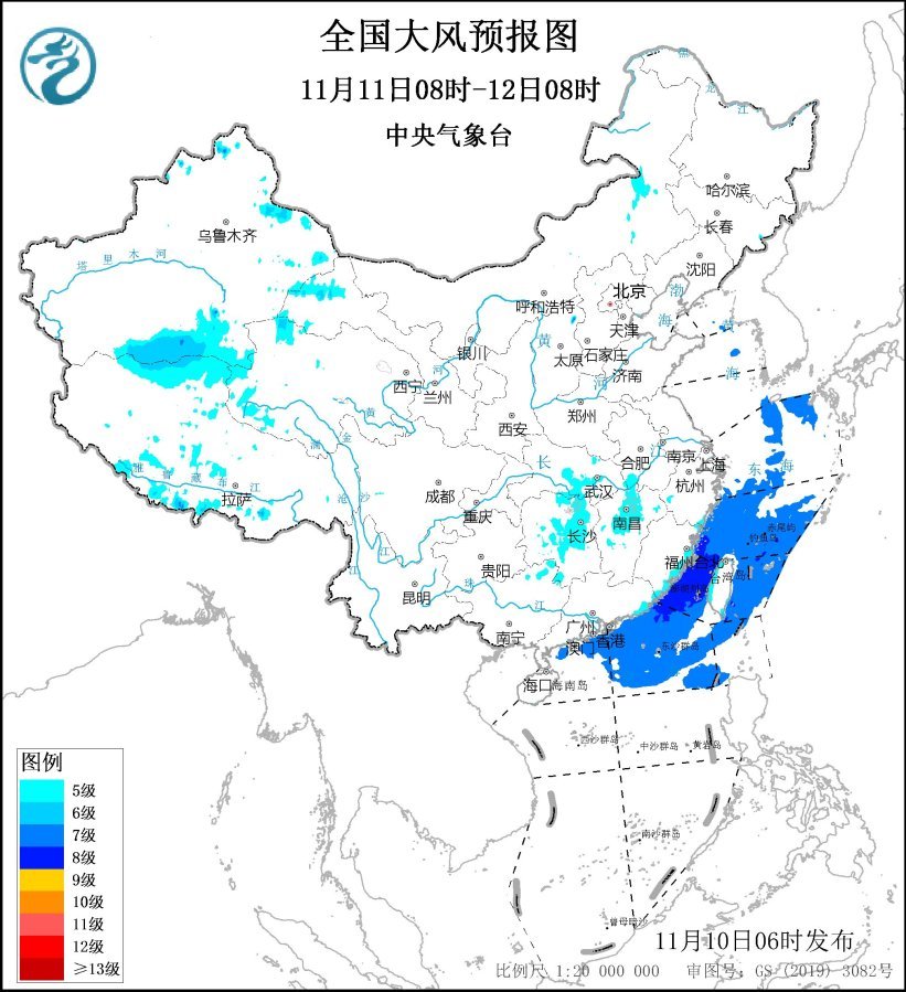11月11日08時至12日08時,安徽南部、湖北中東部、湖南大部、江西中北部、廣西東北部以及福建沿海、廣東東部沿海、臺灣島沿海等地有5~6級、陣風(fēng)7~8級的大風(fēng);東海大部海域、臺灣海峽、臺灣以東洋面、南海北部海域、巴士海峽偏北海域?qū)⒂?~8級、陣風(fēng)9~10級的大風(fēng)。